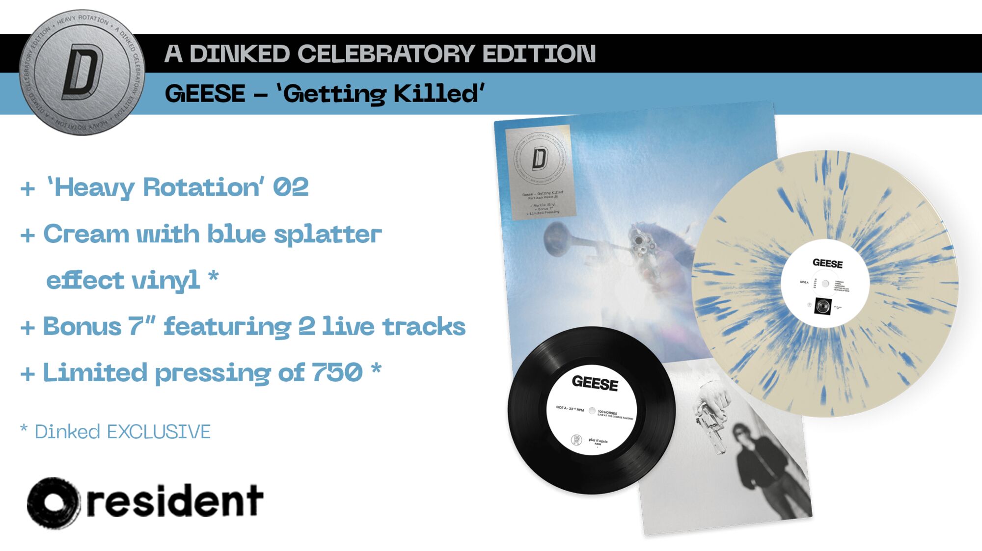From New York’s dive bars to Times Square billboards, Geese have somehow spun pure chaos into unstoppable global momentum. The reaction to their 3rd album has been explosive. So it has deservedly earned its place as our second Dinked ‘Heavy Rotation’ Edition – brought to you in a fancy new colourway with a bonus 7” of 2 exclusive live tracks recently recorded in London at The George Tavern.